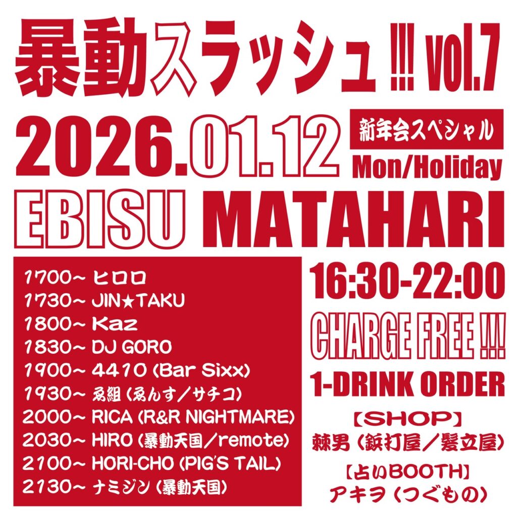 1/12(月・祝) 暴動スラッシュ!!! vol.7INFORMATIONTwitterFacebookはてブPocketLINE 2025.12.301/12(月・祝) 暴動スラッシュ!!! vol.7@恵比寿マタハリ