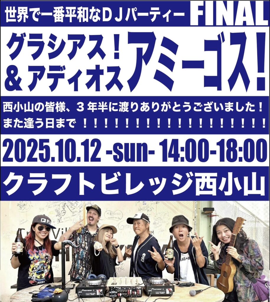 10月12日 (日) グラシアス!&アディオス アミーゴス!INFORMATIONTwitterFacebookはてブPocketLINE 2025.09.30 2025.09.23ラウンジDJファイナル「グラシアス!&アディオス アミーゴス!」@クラフトビレッジ西小山https://craft-village-nishikoyama.com/