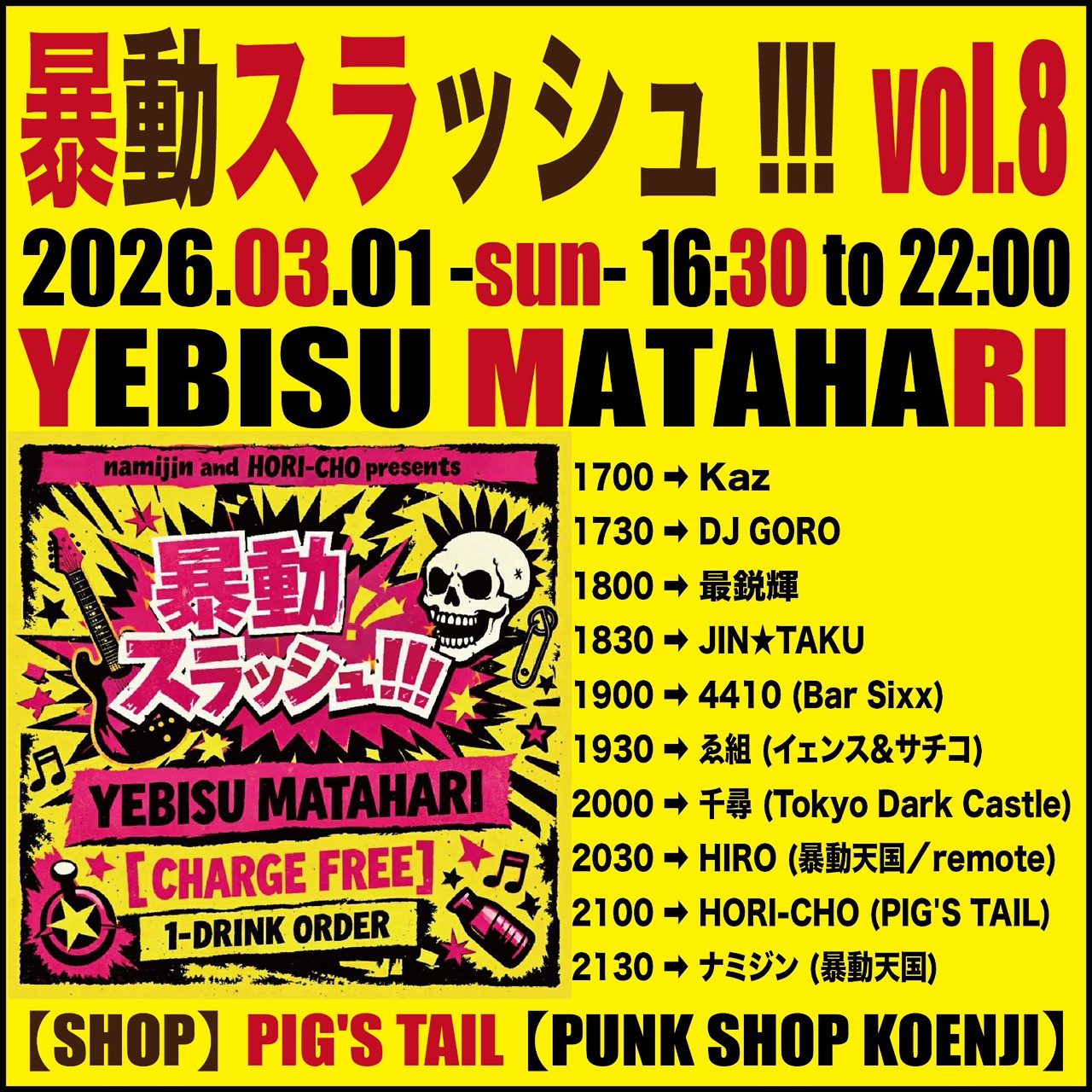 3月1日(日) 暴動スラッシュ!!! vol.8INFORMATIONTwitterFacebookはてブPocketLINE 2026.02.10暴動スラッシュ!!! vol.8@恵比寿マタハリhttps://tabelog.com/tokyo/A1303/A130302/13113837/