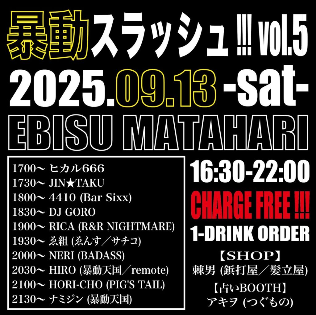 9月13日(土) 暴動スラッシュ!!! vol.5INFORMATIONTwitterFacebookはてブPocketLINE 2025.08.20★暴動スラッシュ!!! vol.5@恵比寿マタハリhttps://tabelog.com/tokyo/A1303/A130302/13113837/
